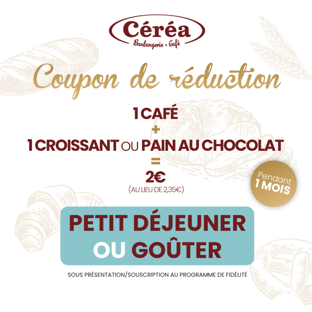 Dégustez un petit déjeuner ou un goûter toute la journée avec notre formule café accompagné d’un croissant ou d’un pain au chocolat.